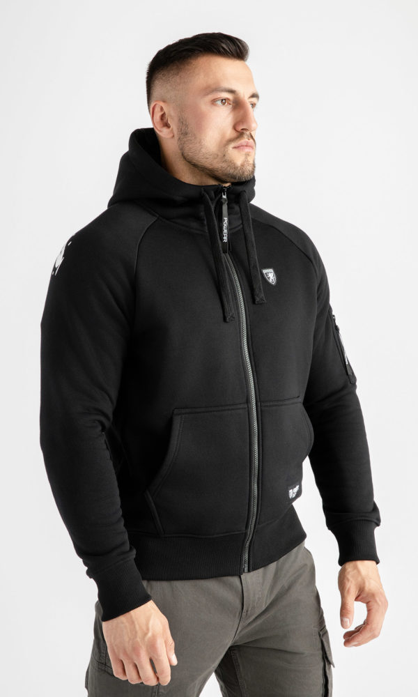 - Integrierte Sturmhaube im Kragen des Kapuzenpullis mit Reißverschluss befestigt