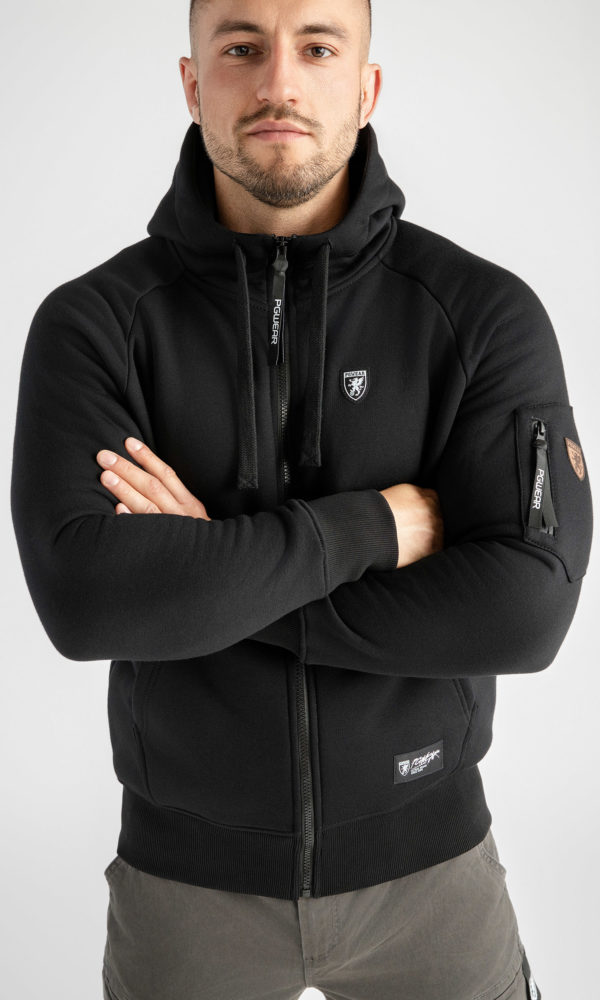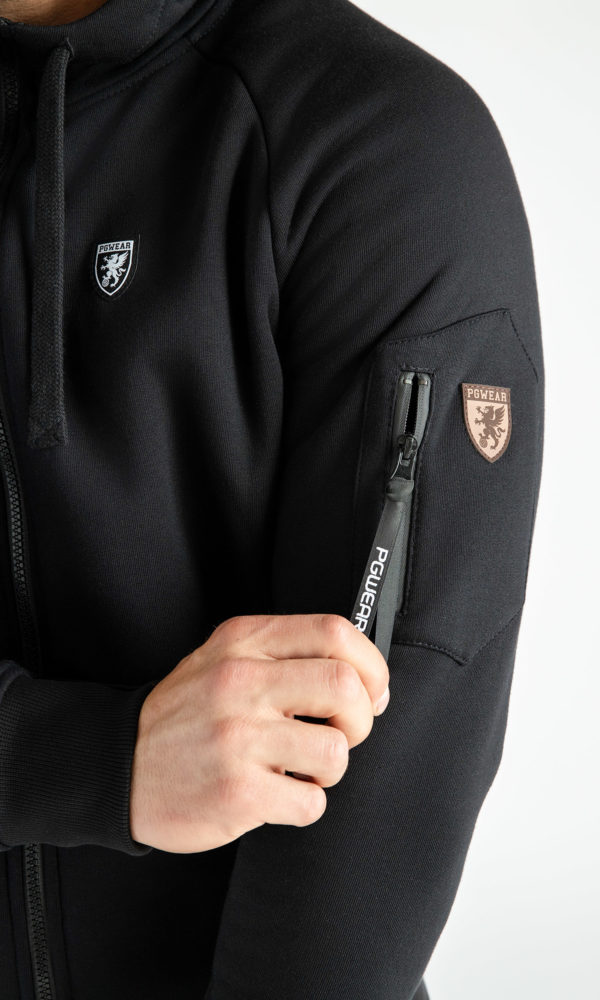 auf dem linken Ärmel eine Tasche mit Reißverschluss, Kängurutasche