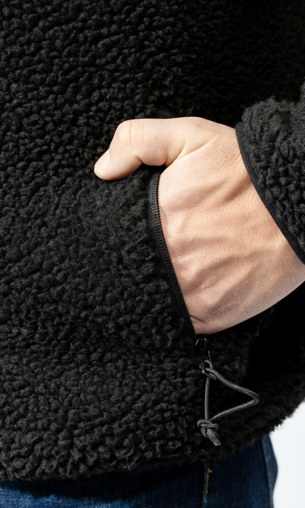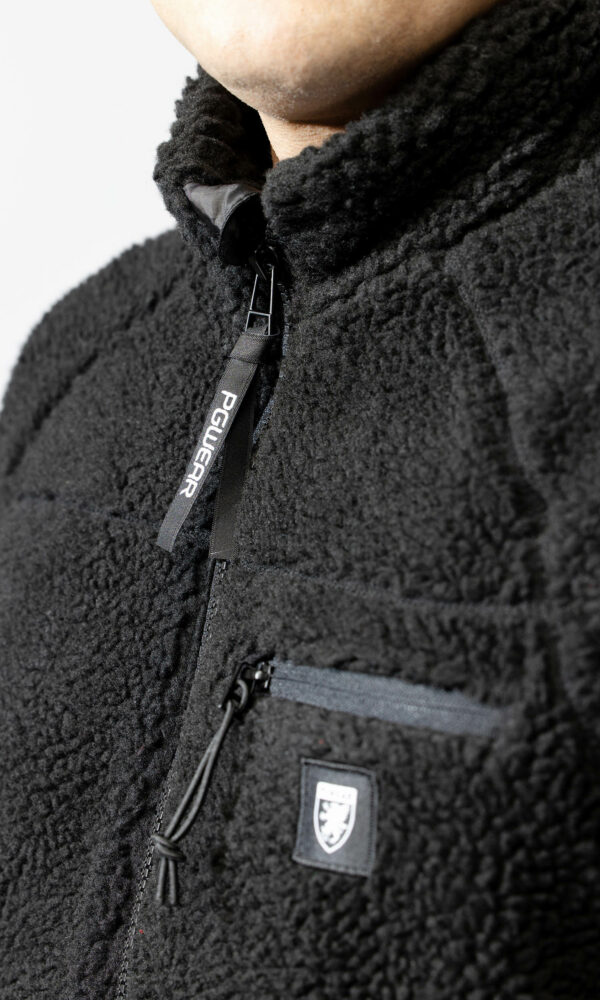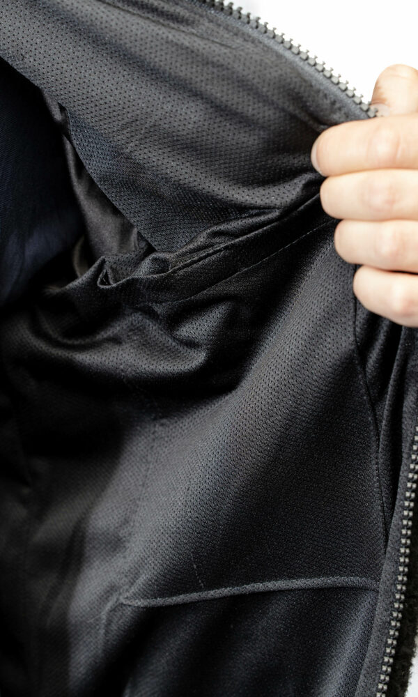 inside pocket, two side pockets with zippers, zippered pocket on the chest